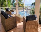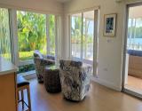 Beautifully landscaped yard with fruit trees and tropical foliage. The screen porch is a favorite spot to kick back and relax, dine or soak in the spa. Ready for the pool? Steps away is a freshwater pool with poolside patio table and sun umbrella and of course more views of the Creek and Ocean.